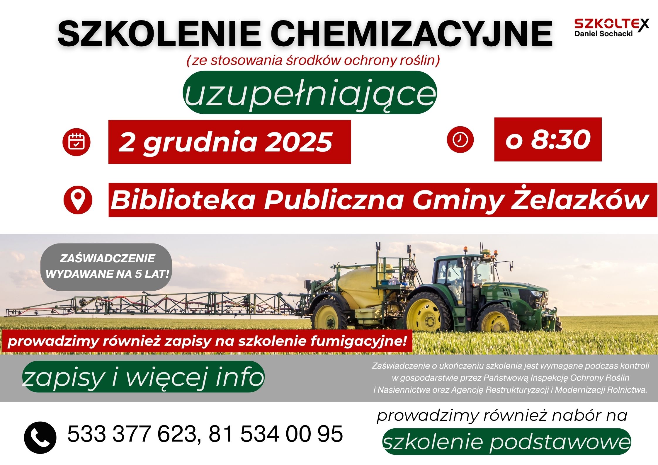 Firma Szkoltex organizuje szkolenie skierowane do rolników w zakresie STOSOWANIA ŚRODKÓW OCHRONY ROŚLIN (szkolenia chemizacyjne – uzupełniające).