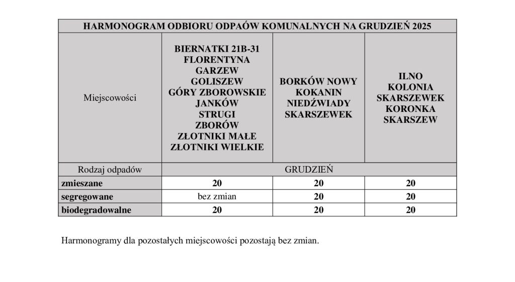 Harmonogramy dla pozostałych miejscowości pozostają bez zmian.