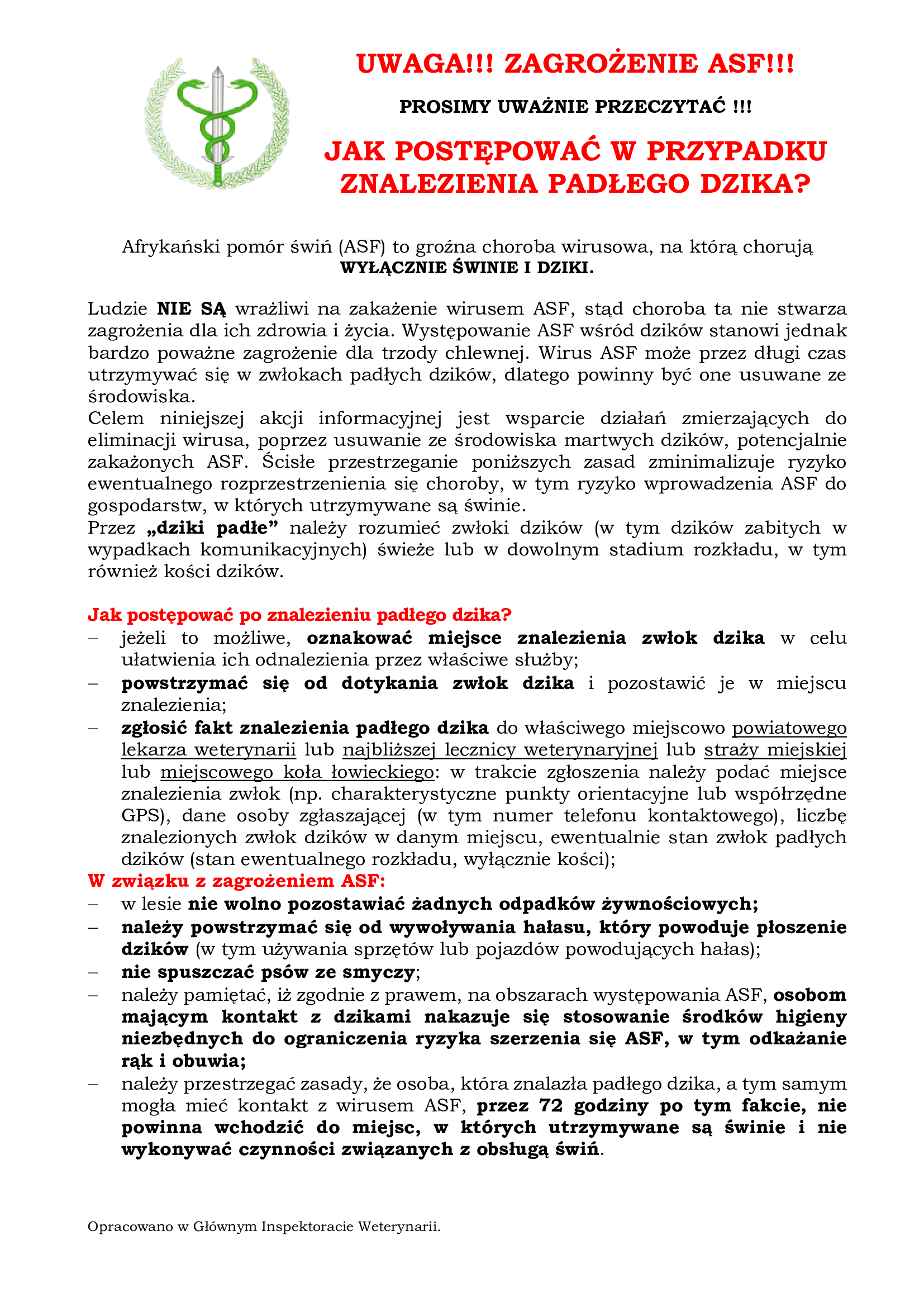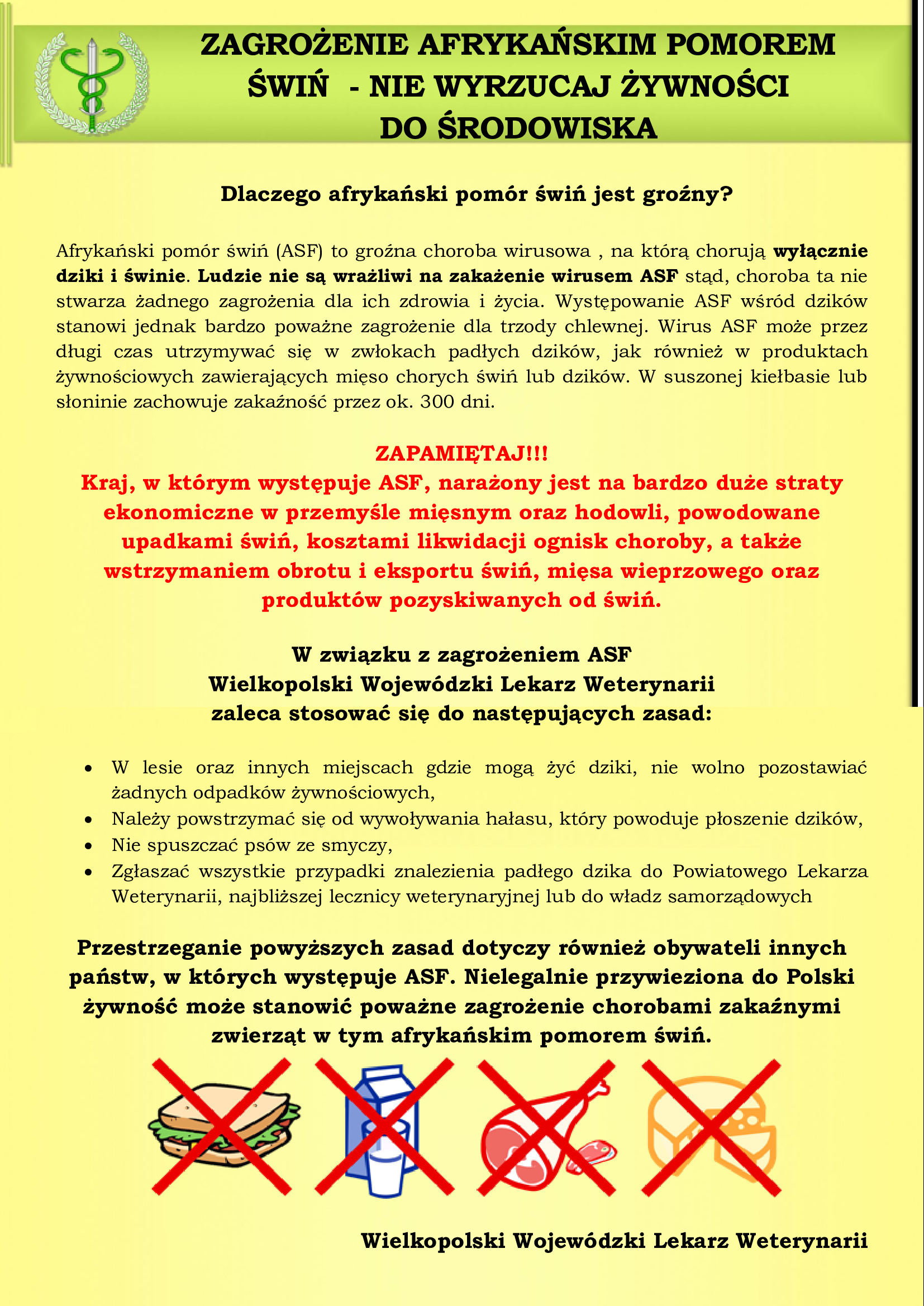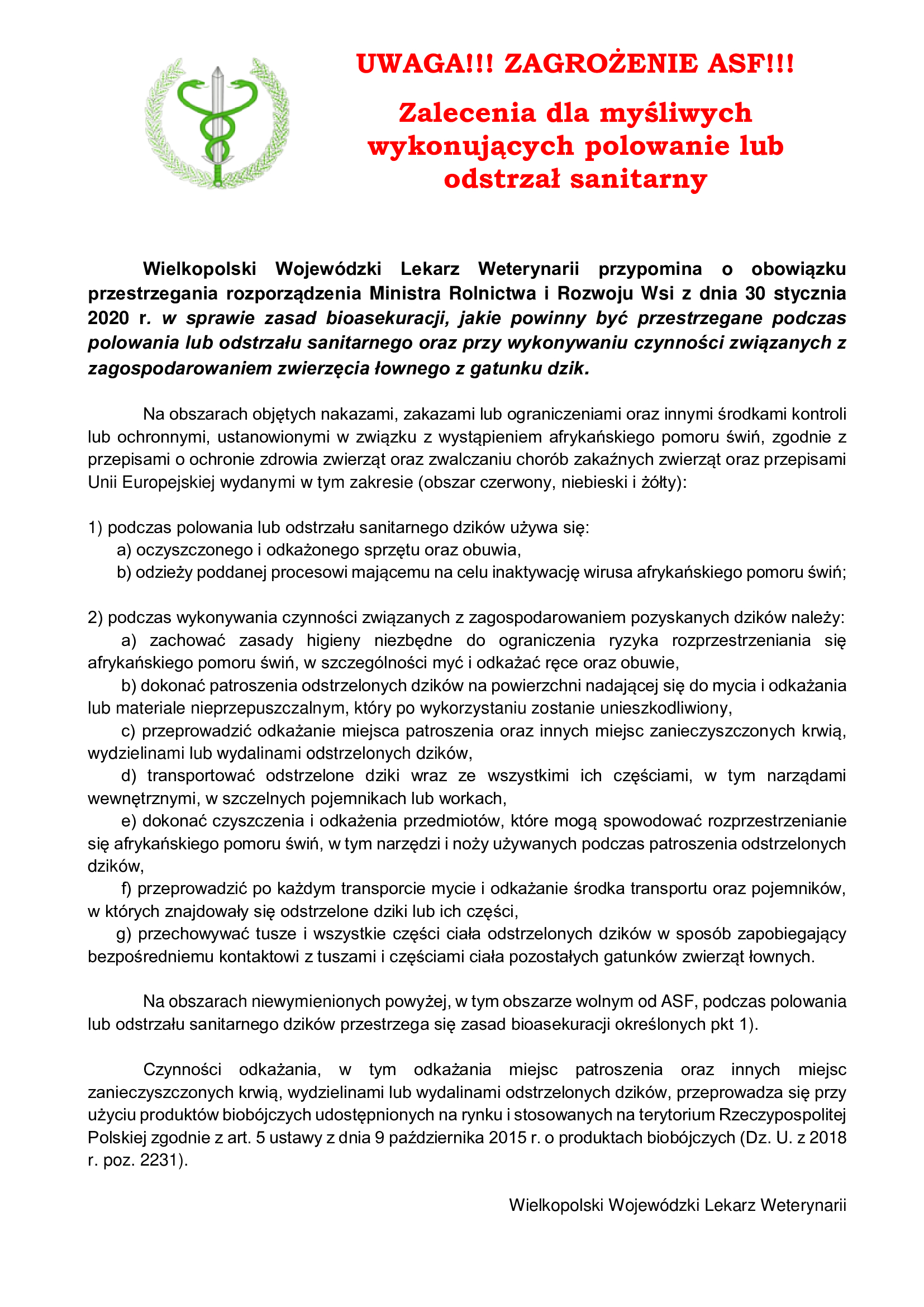 W związku z występowaniem ognisk ASF u trzody chlewnej na terenie województwa wielkopolskiego oraz mając na celu zwiększenie świadomości społeczeństwa w zakresie bioasekuracji, przedstawiamy poniższe informacje.