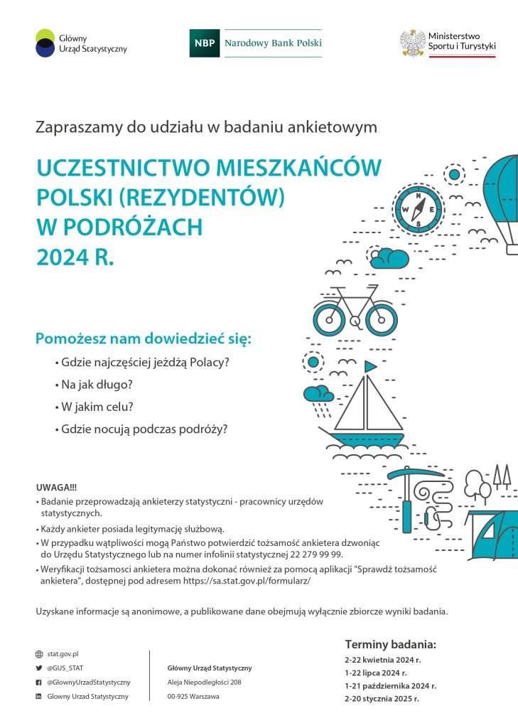 Celem tego badania jest zebranie danych o krajowych i zagranicznych wyjazdach (prywatnych lub służbowych) członków gospodarstw domowych w IV kwartale 2024 roku. Badanie dostarczy kompleksowej wiedzy m.in o skali uczestnictwa mieszkańców Polski w podróżach, rodzajach wykorzystywanych usług turystycznych, poziomie wydatków związanych z podróżami.